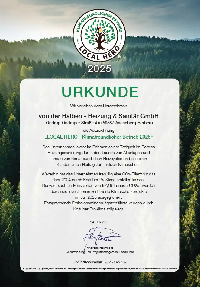Als ausgezeichnetes SHK-Unternehmen zeigen wir Verantwortung für Umwelt und Gesellschaft. Das LOCAL HERO-Siegel hebt unser Engagement hervor und macht CO₂-Ersparnis sichtbar – für uns, unsere Kund*innen und die nächste Generation. Gemeinsam mit Knauber ProKlima haben wir unsere Emissionen bilanziert, reduziert und kompensiert – und beweisen damit, wie nachhaltiges Handeln funktioniert. Mit Urkunde, Marketingpaket und dynamischem Widget auf unserer Website bringen wir diese Botschaft direkt zu Ihnen – klar, sichtbar, wirksam.